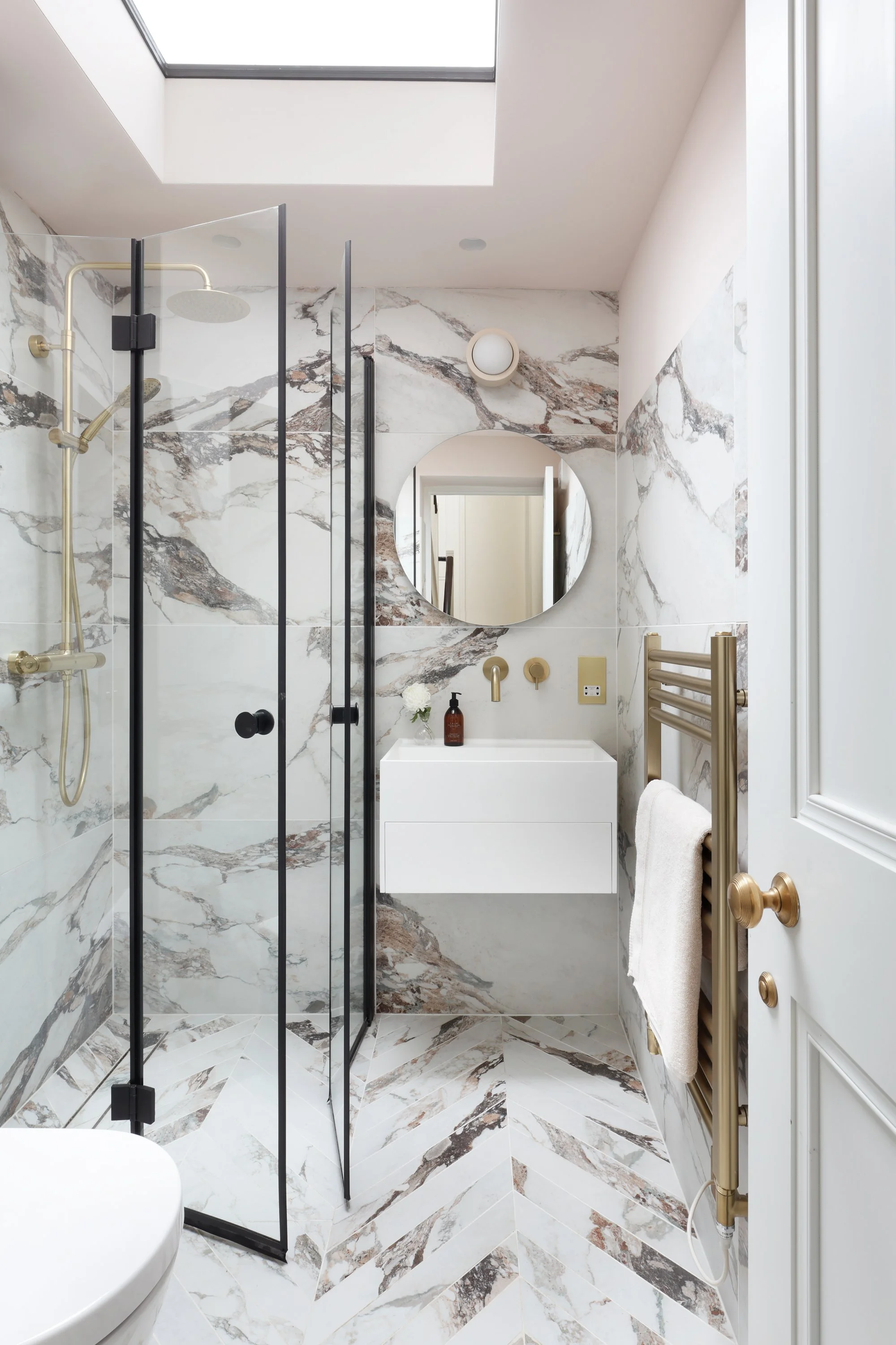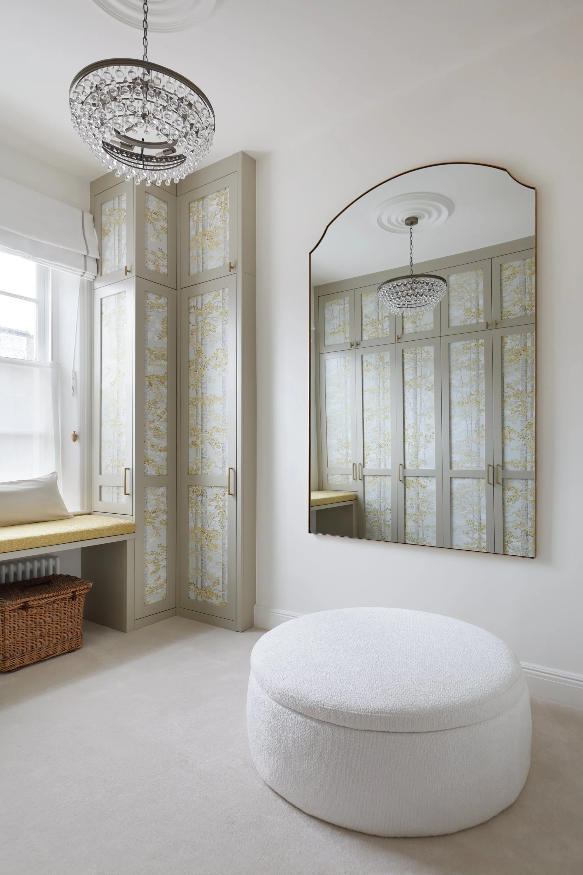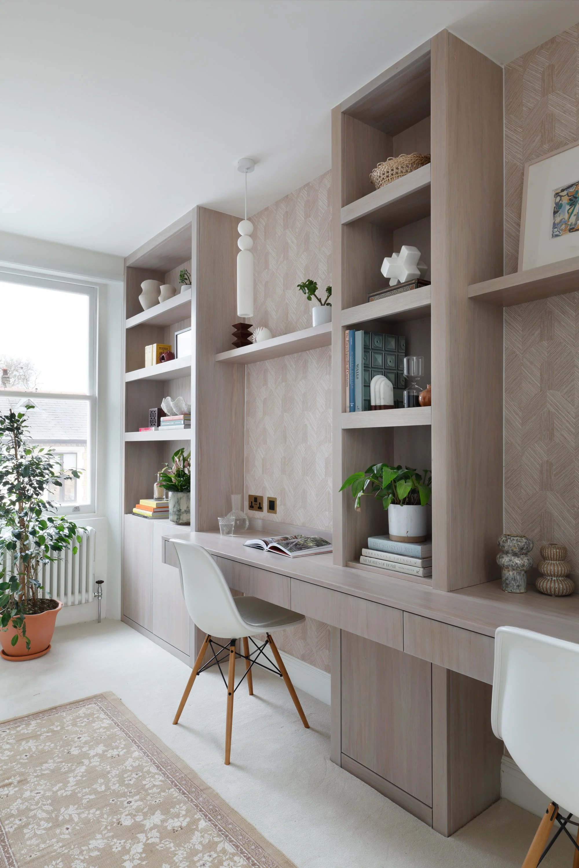 The first floor was reconfigured to achieve an expanded master suite with a walk-in dressing room. Here we introduced seagrass wallpaper, sumptuous tonal drapery, panelled wardrobes and striking chandeliers, alongside high-gloss green marble in a newly formed ensuite. Bespoke joinery ensured that all storage requirements could adapt around these changes, while on the second floor a dedicated co-working space was designed to meet the specific professional requirements of the client.